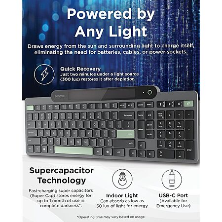Lenovo 800 Self-Charging Bluetooth Keyboard, Uses Ambient Light for Charging, Bluetooth 5.1, for $60