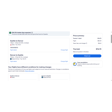 Delta Air Lines, Alaska Airlines, United Airlines and Expedia have round trip airfares travelling to and from Denver (DEN) and Seattle (SEA) for $117, nonstop. These are basic economy fares. On United you may have a personal item. On Alaska and Delta you may have a personal item and a carry-on bag. If you are travelling with children on United or Alaska, you will be seated together as per their policy.