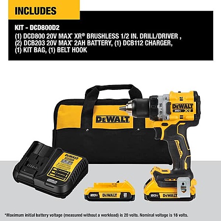 YMMV DeWalt 20V MAX DCD800D2 Cordless Brushless 1/2 in. Drill Driver Kit with (2) 2.0Ah Batteries, Charger and Bag $84.05