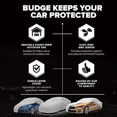 - GUARD YOUR CAR AND ITS FINISH: The Budge Lite Car Cover offers reliable, single-layer polypropylene protection against dust, dirt, and debris, while the soft, non-abrasive fabric helps safeguard your vehicle's paint from scratches