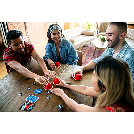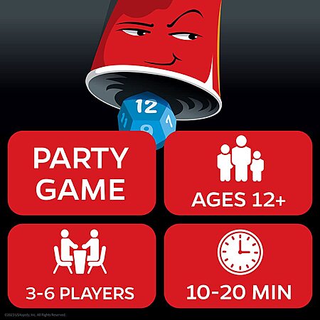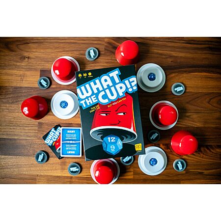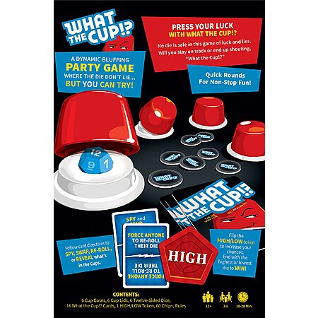 - Includes: 6 Cup Bases, 6 Cup Lids, 6 12-Sided Dice, 16 What the Cup!? Cards, 1 High/Low Token, 60 Chips, Rules