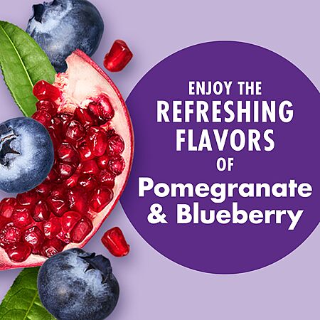 - V8 +energy pomegranate blueberry energy drink gives you the plant based energy you need to be at your best to get the most out of your day. Infused with tart pomegranate and juicy blueberries, this energy drink features a delicious blend of juices, plus natural black tea and green tea to give you roughly the same amount of caffeine as a cup of coffee. Non-gmo, v8 +energy drinks are made with no added sugar, and no high fructose corn syrup. Each 8 fl oz can contains one combined serving of vegetables and fruit, and it's an excellent source of b vitamins. Enjoy a v8 energy drink as part of a well balanced breakfast, or take it with you on a busy day out. These v8 energy drinks can be enjoyed chilled or at room temperature. Not a low calorie food - see nutrition facts panel for sugar and calorie content. Six (6) 8 fl oz cans of V8 +ENERGY Pomegranate Blueberry Energy Drink. Gives you steady energy from natural black and green tea and delivers roughly the same amount of caffeine as a cup of coffee. Plant based energy drink contains 6 deliciously blended vegetable and fruit juices. Non-GMO drink that's free of added sugars. Pomegranate blueberry flavored drink contains one combined serving of fruits and vegetables for an energy drink you can feel good about.