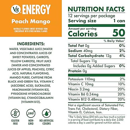 [S&S, AC] $17.30 | 4 × 12-Pack 8-Oz V8 Energy Drink (Peach Mango) ($4.32 each) at Amazon