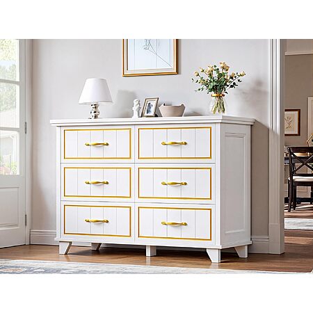 Amazon.com has DWVO Farmhouse Wooden Dresser TV Stand with Power Outlet, 6-Drawer Dresser with Large Storage Drawers and Bar Handles, Ideal for Living Room, Hallway, 47.2" L x 15.7" W x 33.4" H - White & Walnut on sale for $99.99.