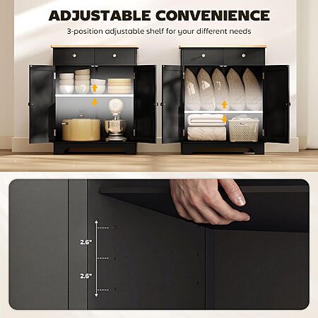 • Roomy Storage: This buffet cabinet utilizes 2 large drawers for utensils or napkins and 2-tiers offering storage space for plates, plastic containers, pots, or pans. Keep organized behind doors so your items stay safe and dust-free. The shelf inside is 3-level adjustable to meet various storage needs.