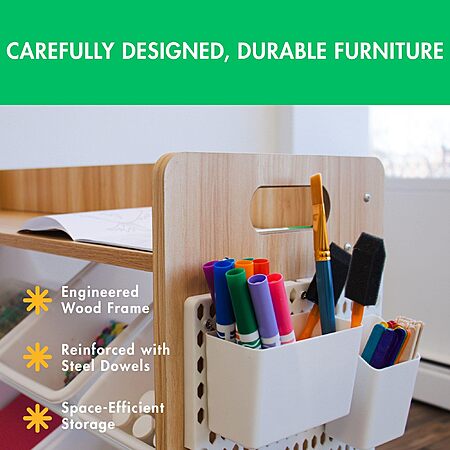 - Equipped with stabilizing braces and a wall anchor anti-tip kit, this organizer ensures your child's play space is as safe as it is fun. Rounded corners add an extra layer of protection for worry-free play.
