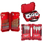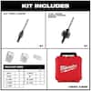 Includes: one 49-22-4025 with 9 hole saw sizes: 3/4 in., 7/8 in., 1-1/8 in., 1-3/8 in., 1-1/2 in., 1-3/4 in., 2 in., 2-1/8 in. and 2-1/2 in., 2 arbors, 2 total pilot bits, hex key and case, one 49-22-0175 8-pieces high speed wood spade bit set with 3/8 in., 1/2 in., 5/8 in., 3/4 in., 7/8 in., 1 in. and 1-1/8 in. bits plus a 6 in. QUIK-LOK extension in a carrying case, one 49-10-9004 3-pieces, oscillating multi-tool blade wood cutting kit with one 1-3/8 in. HCS wood blade, one 2-1/2 in. HCS wood blade, one 3-1/2 in. HCS segmented wood blade