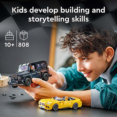 Dual Mercedes: This playset includes two Mercedes F1 toy cars: the Mercedes-AMG G 63 and the Mercedes-AMG SL 63, designed for ages 10 and up.