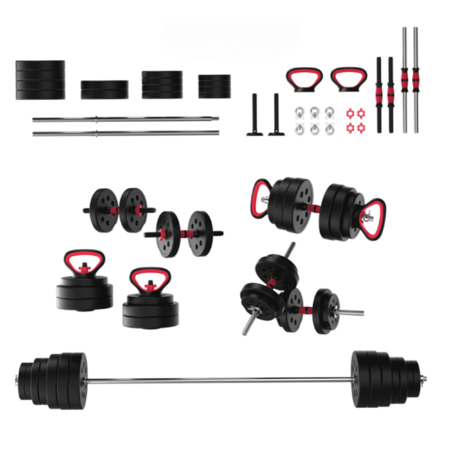 - Includes 4 x 12.5lbs plates, 2 x 10lbs plates, 4 x 5lbs plates, 4 x 2.5lbs plates, 2 x kettlebell bases, 2 x push-up / kettlebell handles, 10 x collar locks, 1 x barbell, 2 x metal dumbbell bars, 2 x plastic dumbbell bars