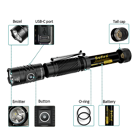 - Includes 18650 battery, two-way clip, lanyard, USB-C cord, spare o-rings, user manual