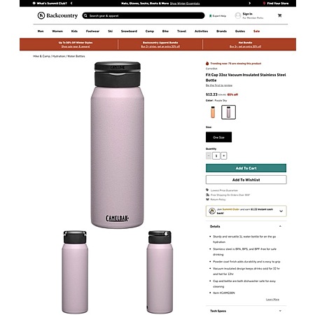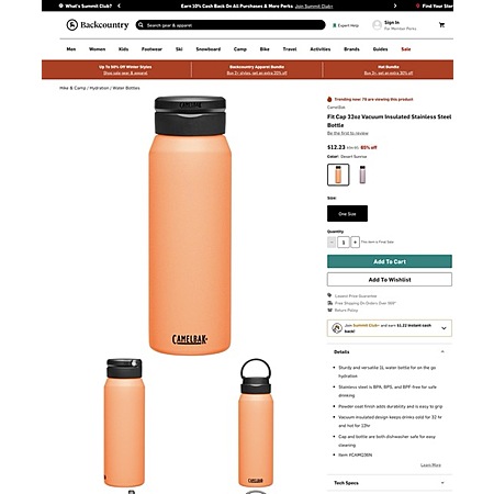 CamelBak Fit Cap 32oz Vacuum Insulated Stainless Steel Bottle $12.23