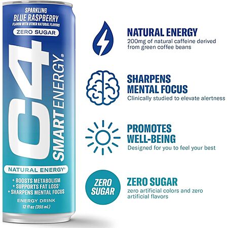 Cellucor C4 Smart Energy Drink ‚ Boost Focus and Energy with Zero Sugar, Natural Energy, and Nootropics - 200mg Caffeine - Blue Raspberry (12oz Pack of 12)~$15.18 With S&S @ Amazon
