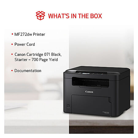 - Includes imageCLASS MF272dw Laser Printer, cartridge 071 black, starter-700 yield, power cord, documentation