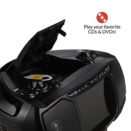 • MULTIPLE PLAYBACK OPTIONS: The boombox offers a variety of playback options, including a top-loading DVD/CD/MP3 player, Bluetooth wireless, USB playback, Aux-in jack, HDMI input, audio/video output, and FM radio.