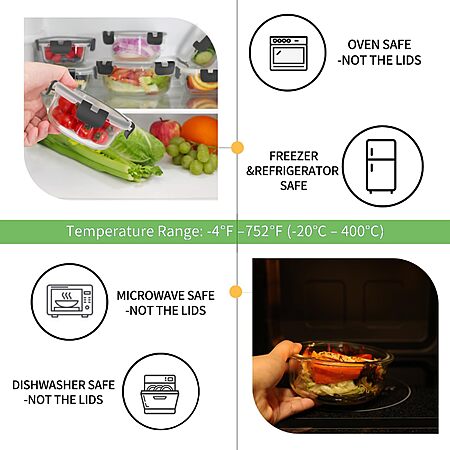 [Microwave/Oven & Freezer Safe] Our containers can withstand temperatures from -4℉ to 752℉, you can use them in oven/microwave(Not the lids) and freezer storage. High quality borosilicate glass is more durable, allowing you to use the containers within the permitted temperature range without worrying about the box breaking. Please not put the lids in microwave/oven to avoid deformation of the lid and silicone strip