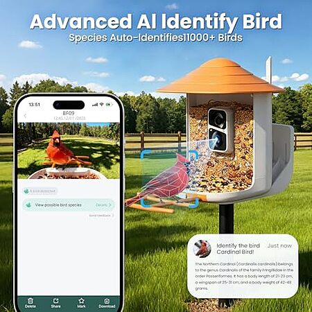 Model: Soliom BF09 Bird Feeder with Camera,Smart Bird Feeder Camera with AI Identify Bird Species, Auto Record Bird Video, Instant Notifications, 5W Solar Panel and 32GB SD Card