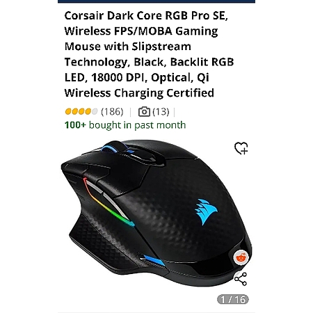 Corsair Dark Core RGB Pro SE, Wireless FPS/MOBA Gaming Mouse with Slipstream Technology, Black, Backlit RGB LED, 18000 DPI, Optical, Qi Wireless Charging Certified