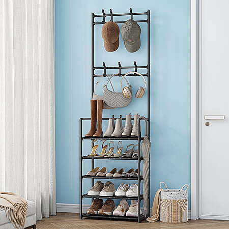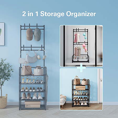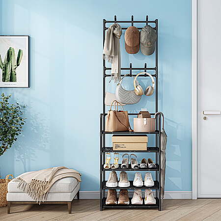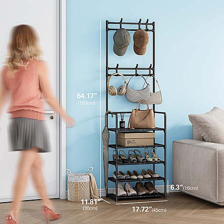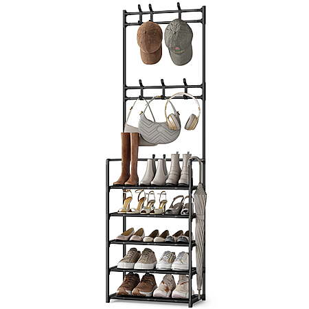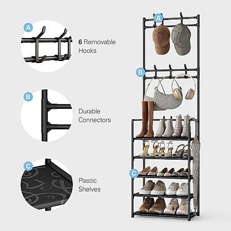 | Product Description: | Upgrade Your Entryway with the Bug Hull 5-Tier Shoe & Coat Rack – The Perfect Blend of Style and Functionality! Struggling with a messy entryway? The 5-Tier Shoe & Coat Rack combines smart storage and modern design to keep your shoes, coats, and accessories neatly organized. Ideal for small spaces like apartments, dorms, or busy family homes, this shoe rack with hooks maximizes storage without sacrificing style. Why This Shoe Rack with Hooks is a Must-Have: ✔ 5 Roomy Shelves + 6 Convenient Hooks – Store shoes, boots, bags, scarves, and jackets all in one place. No more clutter! ✔ Adjustable Shelves – Customize the height to fit anything from flats to tall boots, making it ultra-versatile. ✔ Space-Saving & Slim – At just 12" deep, it fits snugly in tight entryways, closets, or behind doors while holding 8-10 pairs of shoes. ✔ Tool-Free Assembly – Set up in 15 minutes and enjoy instant organization—no hassle required. Transform your entryway into a tidy, stress-free zone where everything has its place. With this shoe rack with hooks, you’ll love how easy it is to grab and go! 🚀 Stay Organized. Stay Stylish. [2-in-1 Design] - Compact coat rack and shoe rack combo is designed to organize your space. It provides a convenient solution for both hanging and storing your essentials. [Space Efficiency] - Measuring 17.7" L x 11.8" W x 64.2" H, this 5-tier organizer fits perfectly in small spaces while offering generous storage. [Extra Storage] - Equipped with 6 removable hooks for hanging bags, jackets, scarves, keys, hats, and umbrellas, and 5 plastic shelves that can hold up to 10 pairs of shoes. [Sturdy & Durable] - Built with a double-row design for extra stability and crafted with premium materials to ensure long-term durability. [Easy Assembly] - Comes with step-by-step assembly instructions and requires no screws or tools, making installation simple and effortless. |
