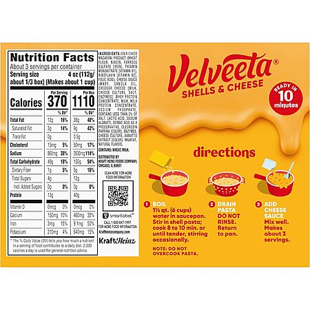 Velveeta Shells and Cheese Mac, 1 Box, for Easy Dinner or Dinner Sides, Original Flavor, Made with Real Cheese, 12 oz~$0.93 With S&S @ Amazon