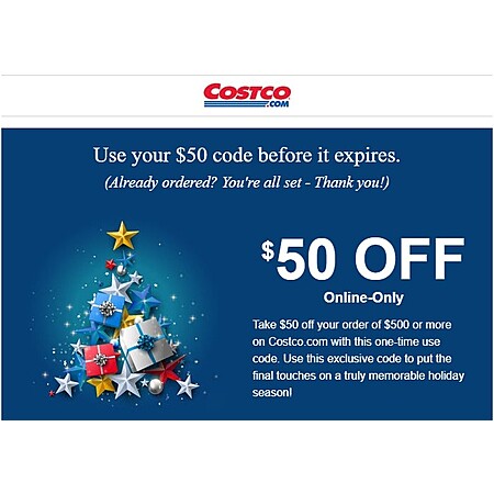 Take $50 off your order of $500 or more on Costco.com with this one-time use code. Use this exclusive code to put the final touches on a truly memorable holiday season!