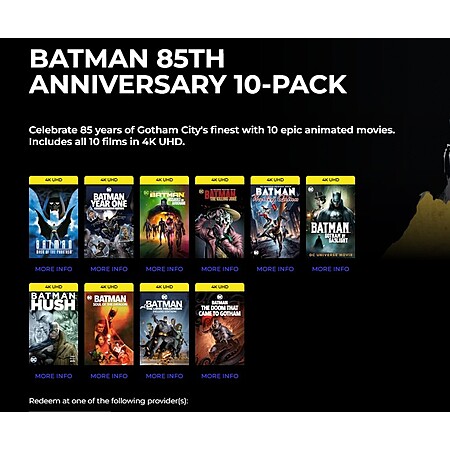 Batman: Mask of the Phantasm, Batman Year One, Batman: Assault on Arkham, Batman: The Killing Joke, Batman and Harley Quinn, Batman: Gotham by Gaslight, Batman: Hush, Batman: Soul of the Dragon, Batman: The Long Halloween, and Batman: The Doom That Came to Gotham.
