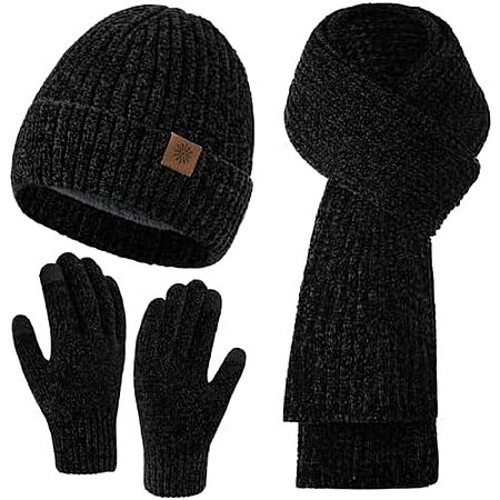 $9.98* | Clothirily Women's 3-in-1 Winter Beanie Hat, Scarf & Gloves Set (Black) at Amazon
