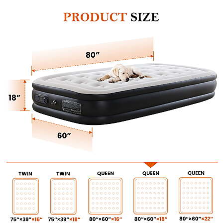| Product Description: | Advantages of ZUNMOS air mattresses include:1. High comfort: air mattresses usually have a soft surface and adjustable firmness, providing a better sleeping experience and comfort.2. High portability: air mattresses can be easily deflated and folded, making them easy to carry and travel with you.3. Good adjustability: inflatable mattresses can be adjusted in terms of firmness and height according to personal preferences and needs, providing a more personalised sleeping support.6. High durability : The high-quality air mattress is made of durable material, which can be used for a long time and is not easy to be damaged. Our air mattress is a good choice to enhance the quality of life! Quick inflation: Equipped with a built-in 110V high-power electric air pump, simply press the button to effortlessly inflate or deflate the gas bed. The inflation time is as follows: 22 inch queen bed -240 seconds, 18 inch queen bed -200 seconds, 16 inch queen bed -150 seconds, 18 inch twin bed -130 seconds, 16 inch twin bed -110 seconds. Our inflatable mattresses are made from a new PVC material formula containing K80 resin, which is known for its durability and increased abrasion resistance, ensuring minimal deformation after extended use. Anti-slip strips have been added to the base to increase stability, reduce noise and prevent tipping or slipping. For convenience, each airbed comes with a repair kit for quick and easy fixing in the event of an accidental puncture or tear. Comfortable and undisturbed: Our camping air cushion top is made of high-quality plush fabric, ensuring a soft and luxurious touch, allowing you to sleep most comfortably. Its moisture wicking function keeps you dry all night long. Efficient storage solution - This mattress comes with a convenient storage bag that can be neatly placed in the cabinet without being discovered when needed. When guests stay overnight, they only need to set it up and can use it anytime. Multiple sizes to choose from: Queen's length is 80 inches and width is 60 inches; The length of Twin is 75 inches and the width is 39 inches. Our air mattress comes in two sizes: twin bed and king bed, with thicknesses of 16 inches, 18 inches, and 22 inches to choose from. The twin bed size is suitable for individual users, while the king bed size is suitable for couples or small families. |