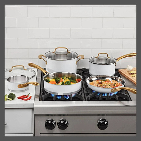 Cuisinart 8PC Stainless Steel Cookware Set 500F Matte White Brushed Gold Pans for $106.99
