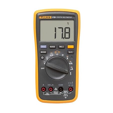 Model: Fluke 17B+ Digital Multimeter, for Electrical Applications, Measures AC/DC Voltage 100V, Current Measurements to 10A, Resistance, Continuity, Diode, Capacitance, Frequency, and Temperature Testing
