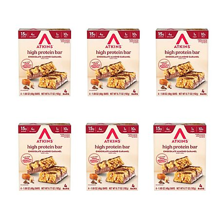 Atkins Chocolate Almond Caramel High Protein Bars, Keto Snacks, 15g Protein, 3g Net Carbs, 1g Sugar, Gluten Free Protein Bars, , 4 Count (Pack of 6) for $33