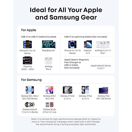 - Quick Power Boost – Experience lightning-fast Samsung Super Fast Charging on all Samsung devices, powered by advanced GaN technology—ideal for instant energy boosts.