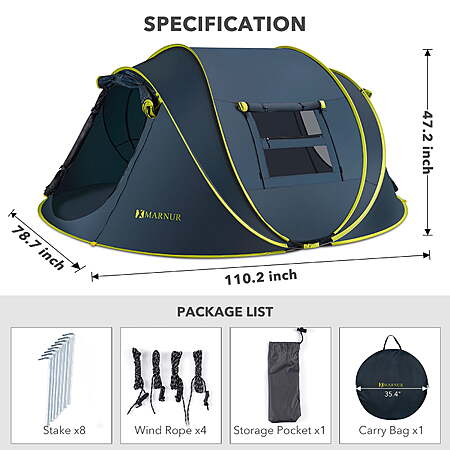 yumo via walmart.com has MARNUR Instant Tent 4-Person Camp Tent, Auto Setup Pop Up Tent, Pordable, Huge Door & Windows, Outdoor, Dark Blue/Green on sale for $53.38. Free shipping.