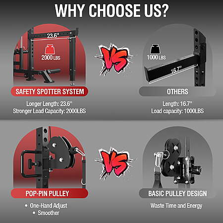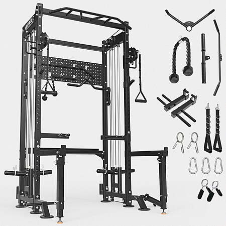 | Product Description: | Discover Mikolo HR01 Power Cage, your ultimate all-in-one home gym solution! Boasting extended safety arms(23"), And we added two height-adjustable support legs, It has a maximum load capacity of 1000LBS, a 6-in-1 design including a power rack, Chin-up station, dip station, landmine, functional trainer and storage system, it offers unparalleled stability and versatility. With an adjustable cable crossover system supporting up to 700 pounds and space-saving efficiency, the HR01 comes fully loaded with accessories for a comprehensive workout experience. Push your fitness limits and achieve your goals with this revolutionary machine! Extended Safety Arms for Ultimate Stability: We have observed that the length of safety spotter arms on power rack on the market is mostly 17"; Our safety spotter arms have been extended to a length of 23". It has a maximum load capacity of 1000LBS. Elevate your workout safety with our 23-inch extended safety spotter arms, reinforced by two extra support feet for rock-solid stability. Adjust the height across seven settings to suit your needs, and enjoy seamless compatibility with a wide array of accessories thanks to our sturdy 2x2-inch upright posts. The Ultimate 6-in-1 Home Gym Solution: Transform your living space or garage into a fully-equipped gym with our versatile machine featuring a wide/narrow chin-up station, functional trainer, power rack, dip station, landmine station, storage system. It's the ultimate all-body workout station, ideal for those looking to stay fit year-round. Revolutionary Functional Trainer for Versatile Training: Our adjustable functional trainer accommodates all heights and training programs, with seven strands of high-precision steel cable capable of supporting up to 700 pounds. Wrapped in premium PU for whisper-quiet, smooth operation, HR01 has an independent 1:1 ratio dual pulleys on both sides. This allows for supersets, drop sets, Compound movements, It is also suitable for heavy weight training, so get your family or friends together and exercise now. Space-Saving Design for Compact Home Gyms: Maximize your square footage with our space-saving power cage, occupying just 12.92 square feet while maintaining top-notch safety. It has three storage stations, The built-in storage keeps your small attachments and accessories organized and accessible. Customize your setup by easily repositioning the pegs to meet your preferences and needs, Two barbell holders and a dumbbell storage rack, it's tailor-made for home fitness enthusiasts. Fit into your home seamlessly. Fully Loaded with Essential Accessories for Comprehensive Workouts: Get more done in less time with HR01, which comes complete with all the essentials for your daily grind. From a pull-up bar, tricep rope, cable handle, cable bar, T-bar and foot peg, it unlocks a vast array of exercises. Whether you're focusing on wide and narrow pulldowns, seated cable rows, bench presses, squats, deadlifts, bicep curls, tricep extensions, pull-ups, or lunges, HR01 has got you covered for a comprehensive workout experience. |