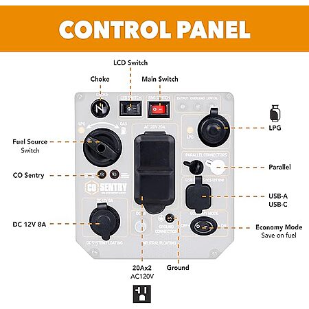 CO Sensor, parallel capable, 1 USB-A and 1 USB-C outlet, LED light for panel, 12v 8a barrel socket, 2 NEMA 5-20 outlets