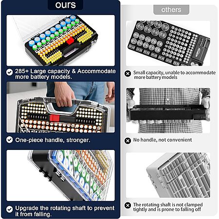 Model: Battery Organizer Storage Holder Box Case with Tester, New Ultra-Large 285+Batteries Double-Sided Variety Pack, Holds AA AAA 4A C D Button Cell 9V 3V Lithium18650 CR2 CR123 CR1632 LR44 (Black)