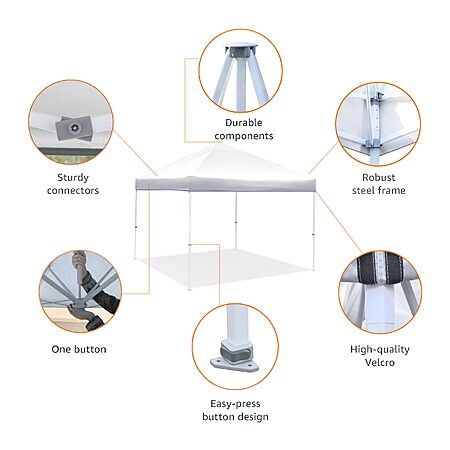 Model: Amazon Basics Outdoor One-Push Pop Up Canopy with Wheeled Carry Bag, 10x10 ft, 8 Pegs and 4 Ropes, 4 Weighted Bags, White
