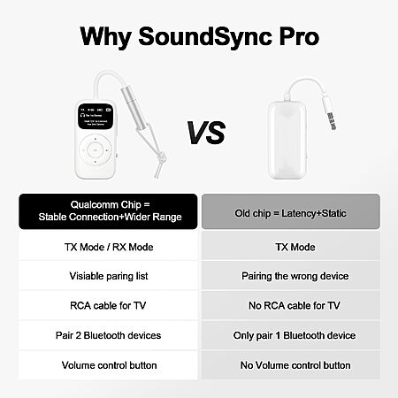 Model: SoundSync Pro Bluetooth Transmitter & Receiver for Airplane, Easy Setup Bluetooth Audio Transceiver for 2 BT Devices, Volume Control, RCA for TV