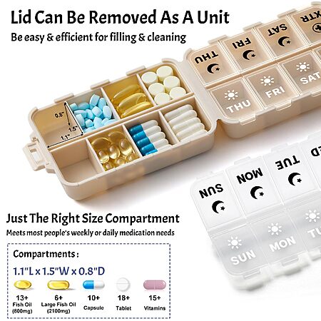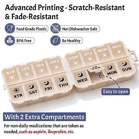 Perfect Compartment Size – Hassle-Free Access: Each compartment is designed to hold a single dose of pills, vitamins, supplements, or fish oil. The snug yet easy-to-open lids offer a smooth user experience. The two extra/8th compartments can be used to store non-daily medications that are taken as needed, such as a**irin or i**profen.