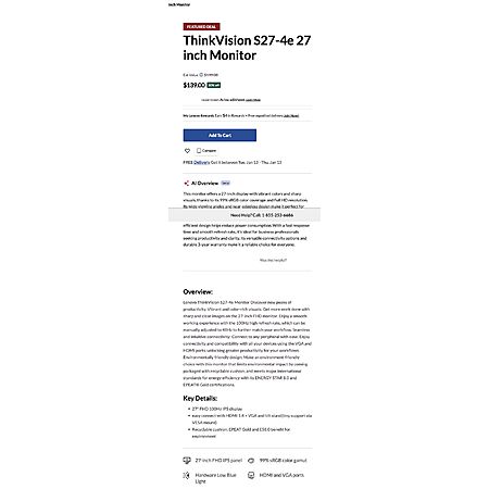 Lenovo ThinkVision S27-4e Monitor Discover new peaks of productivity. Vibrant and color-rich visuals: Get more work done with sharp and clear images on the 27-inch FHD monitor. Enjoy a smooth working experience with the 100Hz high refresh rate, which can be manually adjusted to 48Hz to further match your workflow. Seamless and intuitive connectivity: Connect to any peripheral with ease. Enjoy connectivity and compatibility with all your devices using the VGA and HDMI ports, unlocking greater productivity for your workflows. Environmentally friendly design: Make an environment-friendly choice with this monitor that limits environmental impact by coming packaged with recyclable cushion, and meets major international standards for energy efficiency with its ENERGY STAR 8.0 and EPEAT® Gold certifications.