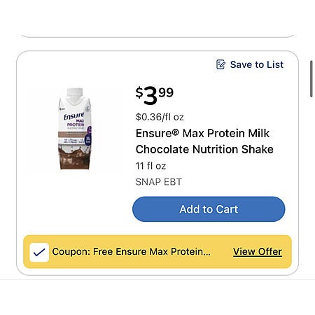 When you buy ONE Ensure Max Protein Chocolate Nutrition Shake on PICKUP OR DELIVERY ONLY. Download and redeem the coupon once from January 7-13 only. Offer valid when you select Pickup, Delivery or Express Delivery. Offer not valid on in-store or DeliveryNOW orders.