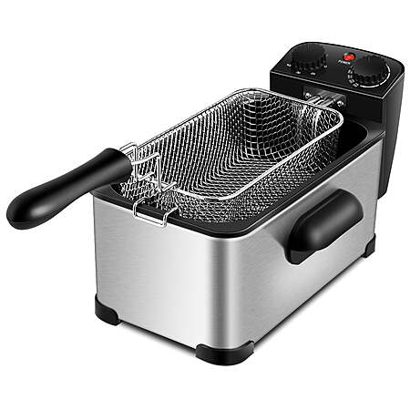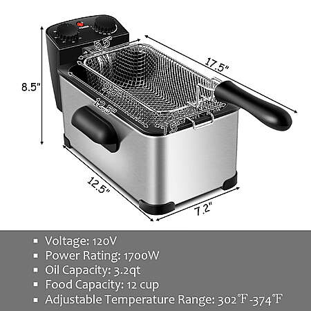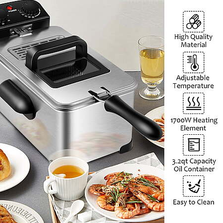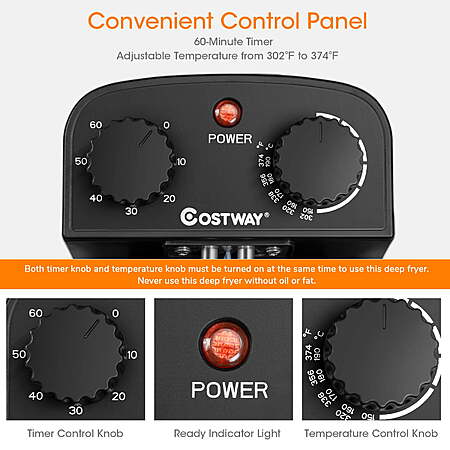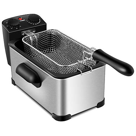 | Product Description: | If you are in the market for a deep fryer that can cook for your whole family. This deep fryer, which can make 12 cups of food, is for you. Featuring a 3.2-quart oil container with max and min oil level and 1700W high performance heating element, our deep fryer can fry food quickly and reach the perfect crisp. Besides, it has adjustable temperature, from 302 degree F to 374 degree Fand 60-minutes timer so that you can set the temperature and time according to your actual needs. Lid with view window not only prevents hot oil splash, but also allows you to keep an eye on the frying process. Anti-slip pads at the bottom increase stability. The designs of removable heating element, non-stick enamel-coated inner, fry basket with hook and round corner make it easy to clean. The anti-scalding cool touch handles make it easy to hold. It is worth mentioning that it is certified by UL. Let our deep fryer make fries, onion rings, fired chicken and other fired food for your friend and family. Feature Perfect to make 12 cups of food, like fries, onion rings, fired chicken and other fired food you like High performance with 1700W heating element, heating up fast and keeping food crisp Adjustable temperature, 302 degree F to 374 degree F, 60-minute timer, meeting your different needs Lid with view window, preventing hot oil splash and keeping clear view Enamel-coated oil pan with large oil capacity, 3.2 qt, UL certified plug Anti-slip pads at the bottom to increase stability 4 anti-scalding cool touch handles, easy to hold Removable heating element, plating coated basket with hook, easy to clean Both timer knob and temperature knob must be turned on at the same time to use this deep fryer Never use this deep fryer without oil or fat Specification Color: Black + Silver Main Material: Stainless Steel, Iron Overall Dimensions: 21.5''(L)x9.5''(W)x8.5''(H) Dimension of Frying Basket:17.5''(L)x5.5''(W)x3''(H) Adjustable Temperature Range: 302degree F - 374degree F Oil Capacity: 3.2qt Food Capacity: 12 cups Power Rating: 1700W Net Weight: 6 lbs Package Includes: 1xDeep Fryer with Basket 1xInstruction Large Capacity & High Performance: Equipped with a 3.2-quart oil container, our deep fryer gives you the ability to make 12 cups of food for the whole family. Featuring a 1700W heating element, which has fast heat-up effect and keeps constant temperature, this deep fryer can fry food quickly and reach the perfect crisp. Adjustable Temperature & Timer: Due to adjustable temperature, from 302degree F to 374degree F, and 60-minute timer, you can set the temperature and time according to your actual needs. You can freely make fries, onion rings, fired chicken and other fired food you like. Safe Guarantee& Humanized Design: a. Lid with view window not only prevents hot oil splash, but also allows you to keep an eye on the frying process. b. Anti-slip pads at the bottom increase stability. c. 4 cool touch handles are anti-scalding and easy to hold. d. The plug is certified by UL. Easy to Clean: The fry basket with hook makes it easy to drain oil and can be lifted. Other than that, the corners of the oil pan help you pour out the oil more conveniently. Both the fry basket and oil pan are easy to clean. And the removable heating element also makes it easy to clean. High Quality Material: a. The body is made of stainless steel, which has good corrosion and heat resistance. b. The inner liner is made of iron with enamel-coated surface, which is non-stick. The fry basket is made of iron with surface plating treatment, which is both beautiful and sturdy. |