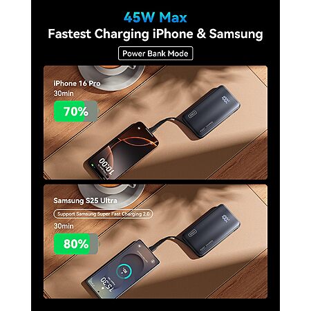 • 45W Fast Charging: Delivers up to 45W output in power bank mode for full-speed charging of iPhone 16 Pro Max, Samsung S25, and even laptops.