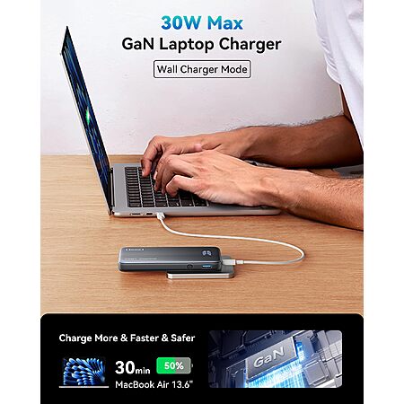 • 30W GaN Wall Charger: Provides 30W output with pass-through charging to power devices and recharge the bank simultaneously; charges MacBook Air to 50% in 30 minutes.