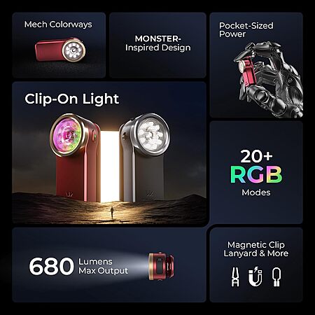 [Small Powerful Flashlight] Feature spotlight(680Lumen)/floodlight(320Lumen)/RGB light triple light source design, 8 brightness levels available, providing versatile illumination for various needs.