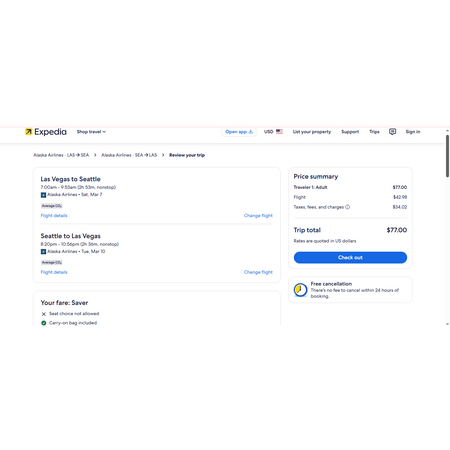 Alaska Airlines and Expedia have round trip airfares travelling to and from Las Vegas (LAS) and Seattle (SEA) for $77, nonstop. These are basic economy fares that allow a personal item and a carry-on bag. There is no seat selection and no change. If you are travelling with children on Alaska, you will be seated together as per Alaska's policy.