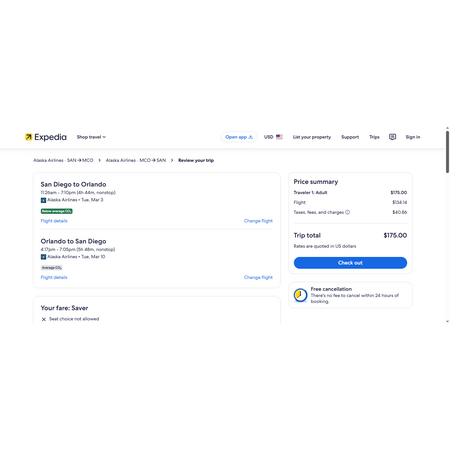 Alaska Airlines, and Expedia have round trip airfares travelling to and from Orlando FL (MCO) and San Diego (SAN) for $175 nonstop. These are basic economy fares. On Alaska, you may have a personal item and a carry-on bag. There is no seat selection and no change. If you are travelling with children, you will be seated together as per Alaska's policy.