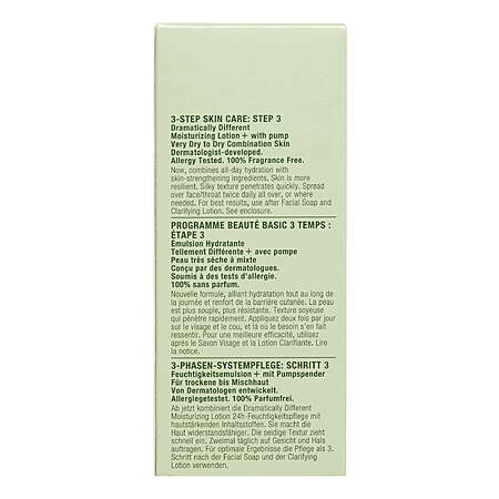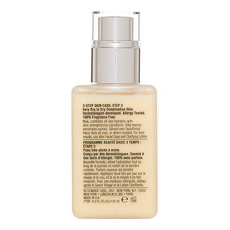 What it is: A dermatologist-developed lotion that's Clinique's #1 face moisturizer. The silky, fast-absorbing moisturizing lotion with pure urea and glycerin rapidly strengthens the skin barrier.Who it's for: Ideal for very dry-to-dry-to-dry-combination skin types.What it does: The daily moisturizer provides 8-hour hydration and soothing moisture for your face. It hydrates to soften, smooth and improve by replenishing skin's oil-water balance for a healthy complexion. The skin-strengthening formula strengthens skin's own moisture barrier so more moisture stays in. The silky formula slips on easily and absorbs quickly. It's suitable for post-procedure skin, as soon as one day post a nonablative laser procedure*.*Shown to be safe for use following a nonablative laser treatment in a 14-day clinical usage test.Key ingredients:- Pure urea: a humectant that occurs naturally in skin. It helps pull in water and bind moisture to skin to help keep it hydrated and balanced- Pure glycerin: a powerful humectant that supports your skin's natural moisture barrier by attracting moisture from the air and retaining water in skin to help keep skin hydrated- Pro-lipids: three pro-lipids help support skin's natural barrierHow to use: Spread the moisturizer all over face and throat, or where needed, twice daily. For best results, use after Facial Soap and Clarifying Lotion (sold separately).Pro tips: Clinique's dermatologist-developed 3-step routine is simple, effective, iconic. Created by the brand's founding dermatologist, 3-Step Skin Care is scientifically designed to create healthy skin. Just 3 steps, 3 minutes, twice a day. Each step is tailored to your Clinique Skin Type.Step 1: Cleanse with All About Clean™ Liquid Facial Soap (sold separately)Step 2: Exfoliate with Clarifying Lotion (sold separately)Step 3: Moisturize with Dramatically Different Moisturizing Lotion+™, oil-free Gel, lightweight Jelly or rich Cream- 100% fragrance-free; paraben-free; phthalate-free; drying alcohol–free; sodium lauryl sulfate–free; sodium laureth sulfate–free- Dermatologist tested- Nonacnegenic- Allergy tested