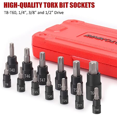 RIMKOLO 13-Piece Torx Bit Socket Set, 1/4”, 3/8” and 1/2” Drive T8-T60 Star Socket Set, S2 Steel Bits and CR-V Sockets with Storage Case $13.76