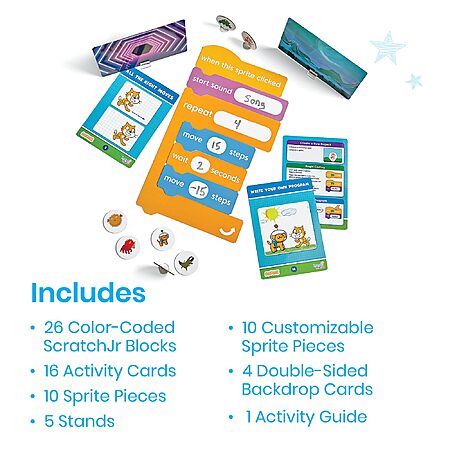 - DEVELOPED IN PARTNERSHIP WITH THE SCRATCH FOUNDATION: Includes 41 Color-Coded Scratch Blocks, 16 Activity Cards, 10 Sprite Pieces, 10 Customizable Sprite Pieces, 5 Stands, 1 Activity Guide