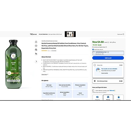 $3 WM Cash + Herbal Essences Argan Oil Shampoo, Hemp Oil Conditioner or Hemp Oil Conditioner w Camellia Oil 13.5 fl oz $4.88
